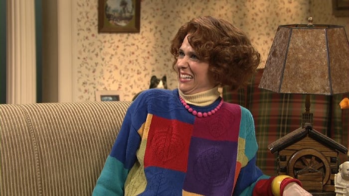 She was back in full force, 90's block sweater and all, and commanding the attention in the sketch because that's not only what Sue does, but that's what Wiig does, as an SNL alum. In the sketch, Aunt Sue was part of a big surprise that her nephew was coming home for Thanksgiving, but she had to get through the sketch with the knowledge of this huge secret that weighed on her so heavily that she shoved her head inside of a turkey and ate an entire pillow. So yeah, pretty much what you'd expect from her.