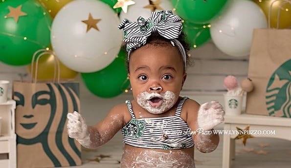 Fayetteville, Georgia-area photographer Lynn Puzzo was recently tasked with the super fun job of coming up with a cool cake smash photo session for an adorable 1-year-old little girl named Aria. As Puzzo explained to Romper in an email, she had just moved to Fayetteville from across the country and was trying to come up with something creative to "help me get noticed so I can book some new clients." While Puzzo often books newborn photo shoots, she decided to do a cake smash session with Aria featuring something she loves herself; good old Starbucks. And judging from Aria's joy as she smashes that cake on Instagram, she didn't exactly hate the gig either.
