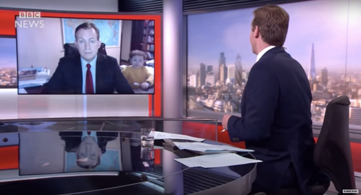 The cutepocalypse (yes, I did that) doesn't end there. A tiny tot in a walker quickly follows the toddler into the room. Kelly apologies to the BBC anchor repeatedly, acknowledging the interruption without letting it break his composure. You can tell, though, that the professor really wants to laugh.
