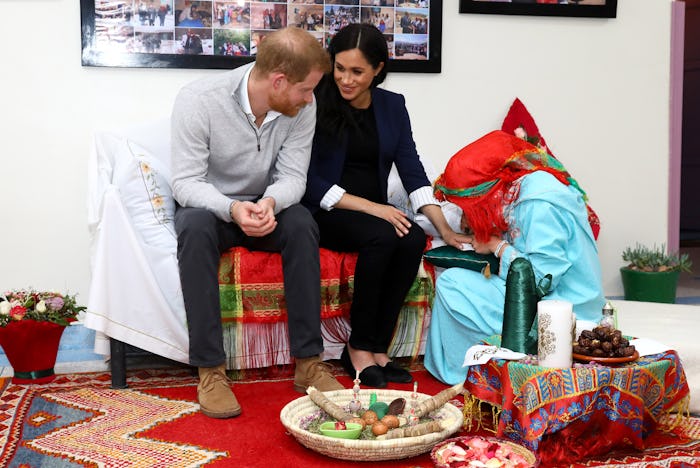 Meghan Markle is about seven months pregnant and her business trips are likely a little more *involved* than yours, given the distance she's traveling (but she also has that whole being a member of the royal family thing that you don't have access to, so...). Markle and husband Prince Harry traveled to Morocco as part of a short royal tour, the couple's last scheduled trip together before Markle gives birth to baby Sussex. They've visited charities and toured a girls' boarding house located in the Atlas Mountains. While at the boarding house, Meghan Markle got a henna tattoo with the sweetest meaning while on a royal visit to Morocco as Prince Harry sat by her side — and the moment echoed one from Kate Middleton's pregnancy with Prince Louis.