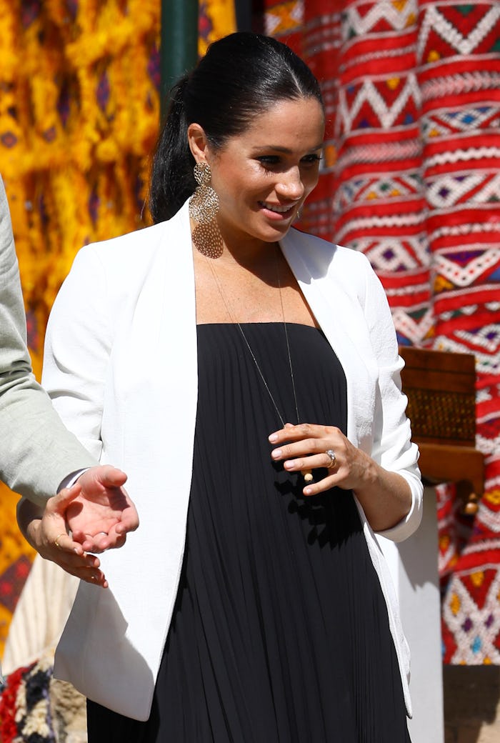 Just because she's a member of the royal family now, doesn't mean Markle is always dressed up. During a portion of her visit to Morocco, the former actress went to the Moroccan Royal Federation of Equestrian Sports, according to ELLE. During the trip, she wore a breton-striped top, black jeans, a green military-style jacket, and heeled ankle booties. As noted by ELLE, her hair was slicked back into a perfectly polished ponytail.