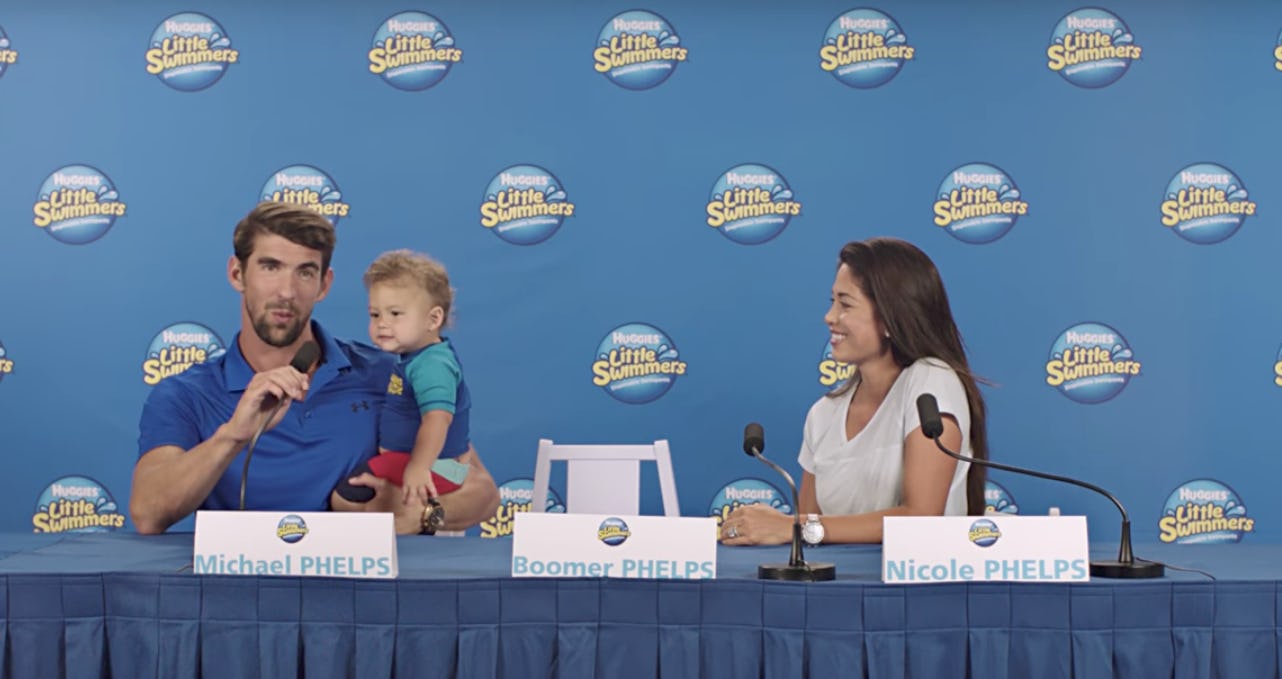Summer is upon us, which means that everyone is ready to hit the pool or the beach. Even babies who aren't potty trained. Which is exactly why Michael Phelps and Huggies Little Swimmers have teamed up to start training this season. In an adorable new campaign, the Olympic winner staged a press conference with his wife Nicole and son Boomer to announce that he's ready to start training this summer for 2032. No, not Phelps, since he'd probably be aged out by then. But baby Boomer? That guy is ready to swim. Phelps announced Thursday morning that he's ready to get Boomer in the shallow end as soon as possible. He said in the faux-press conference: