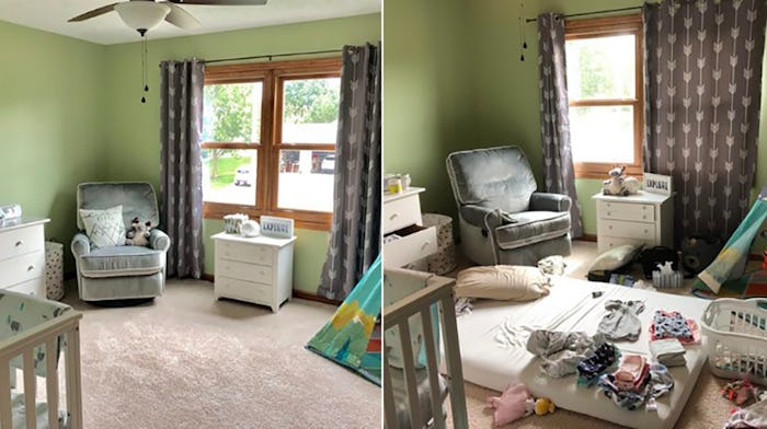 "I mostly feel pride when looking at these two pictures side-by-side. I was proud of myself for finishing the nursery while 37 weeks pregnant and so happy with how it turned out," she tells Romper via Reddit's messaging app. "That first picture brings back the feelings of excitement and anticipation that I had waiting on the arrival of my daughter. I sat in the rocking chair staring around the completed room dreaming about what she’d be like and how it would feel to rock her and read to her."