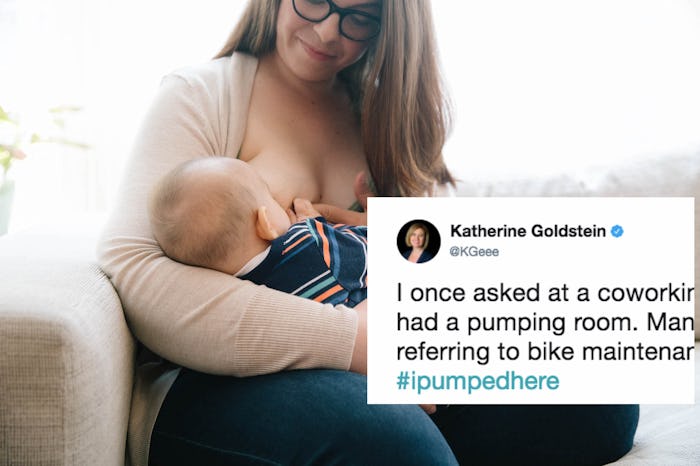 If you're a working mom who has had to pump in a space entirely unsuitable for pumping, right now is the perfect time to share your story. In honor of National Breastfeeding Month, advocacy group MomsRising.org is encouraging women to share pumping stories using the hashtag #IPumpedHere. Once you take a look at the many tweets that have come from the hashtag, it becomes clear why public breastfeeding acceptance is so important for moms and their kids.
