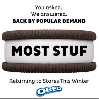 I don't know about you but I will definitely give these Most Stuf Oreos a try. And do you know what else I'll do just in the name of snack science? I'll go ahead and wedge an extra cookie in the middle to see if it's a better ratio.
