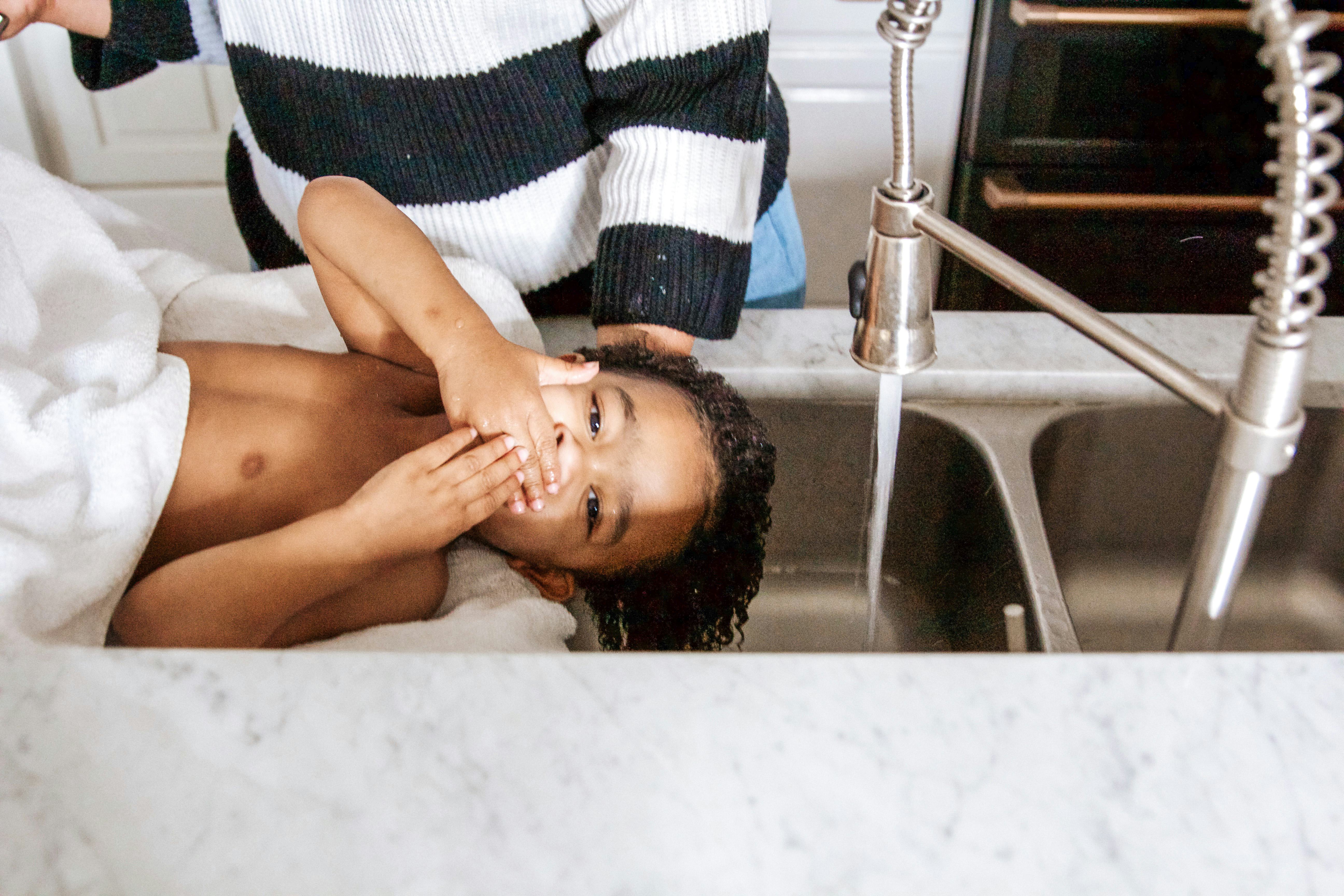 When it comes to raising kids, there's always a new challenge. Things as simple as bath time may require some quick on-your-toes thinking to keep things together. When Creed hit 2 years old, he suddenly started hating water in his face during bath time hair washings. And when I say hate, I mean hate — he goes into a full-on panic and tries to jump out of the tub! I tried a few different ways to wash his hair, but his curly texture requires a thorough wash weekly so we figured we'd try washing it in the kitchen sink.