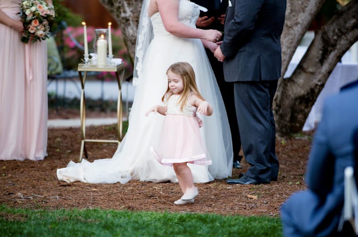 When my husband and I got married, my daughter was just 2.5 years old. She wore a pink and gold dress without a fuss, she walked me down the aisle without even attempting to let go of my hand, and she made it through the entire ceremony and about a third of the reception before blissfully falling asleep in my mom's arms. Not once did she lose her cool or act how so many expected a 2-year-old to act, and I honestly think it's because we basically made the entire wedding about my kid and our becoming a family.