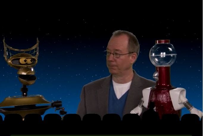 For the uninitiated, Mystery Science Theater 3000 (or MST3K to the cool kids) was a very weird show that ran from 1988 to 1999, first on a local Minneapolis station, later on Comedy Central, and then briefly on The Sci-Fi Channel (now known as SyFy, which airs things like Sharknado and the like; good call canceling MST3K, SyFy). The premise was that two evil scientists were trying to devise a way to weaponize bad movies. They kidnapped a janitor named Joel and sent him into space to use him as a guinea pig. Imprisoned on the Satellite of Love, Joel is forced to watch bad movies until he dies. To keep himself from going crazy, he builds two robot companions named Crow and Tom Servo, as one does. The robots watch the movies with him, and the three of them provide commentary (aka riff on the movies). Most of the actual screen time was devoted to the movies, with silhouettes of Joel, Crow, and Tom Servo at the bottom of the screen, talking over the movie.