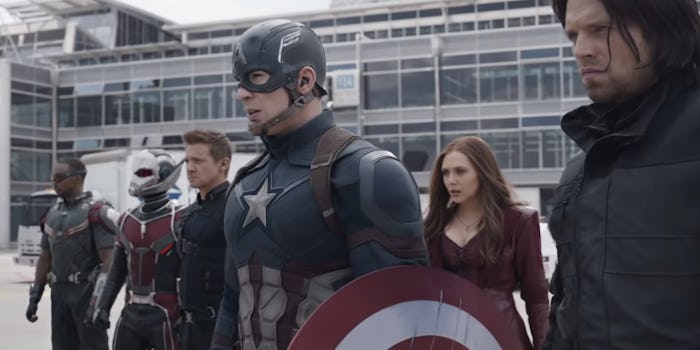 In typical Marvel style, of course, the comic behemoth gave viewers the opportunity to battle it out over social media, tweeting footage of the new trailer, along with shortcuts for fans to cast their support for either side. (Team Cap right here, because duh.) "United we stand," the company wrote. "Divided we fall." A harbinger of future catastrophe? Tell me you didn't get the chills just then, I dare you.