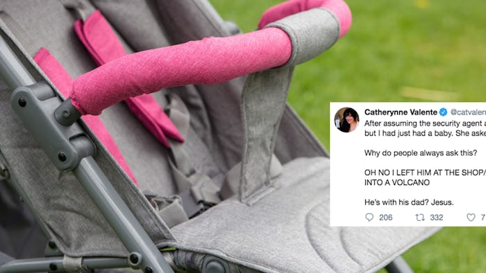 "After assuming the security agent assumed I was pregnant, I told her no, but I had just had a baby," she wrote in another tweet. "She asked where the baby was. Why do people always ask this? OH NO I LEFT HIM AT THE SHOP/SOLD HIM TO A FAIRY/PUNTED HIM INTO A VOLCANO. He’s with his dad? Jesus."