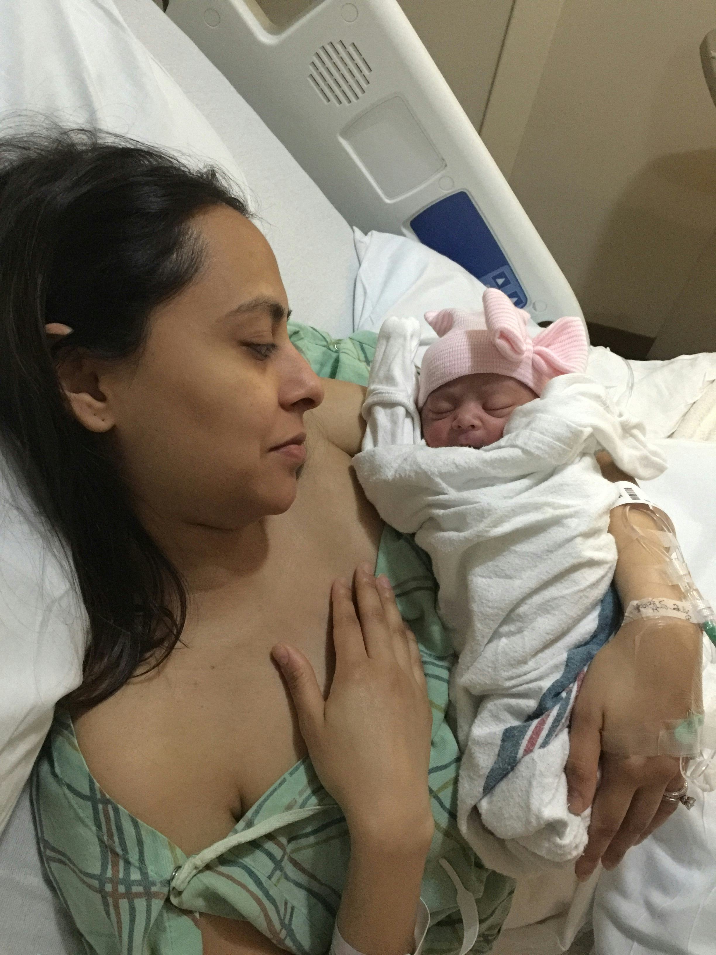 Shortly after the procedure, I was given ice chips. I was told that I couldn't have any water or food. I was exhausted and starving. The last thing I ate was at 6:00 p.m. on a Sunday, and I had my daughter at around 2:30 a.m. on Monday morning. But I still had to muster up the energy to try and breastfeed.