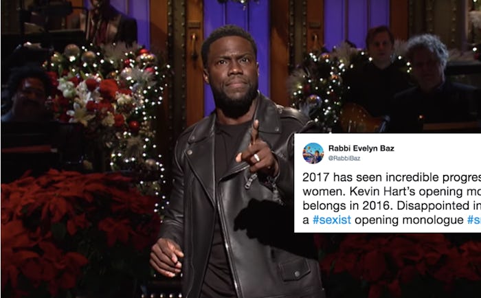 Part of being a comedian is knowing that some people are going to be offended now and again by your jokes, and no one knows that more than Kevin Hart after his Saturday Night Live monologue this week. During the opening segment on SNL, Hart spoke mainly about his new baby, born in late November, with wife Eniko Parrish and the perils of parenting. But his bit about gender roles and parenting fell totally flat and made a lot of people rightfully upset on social media. Romper's request for comment from Hart's rep regarding the backlash was not immediately returned.