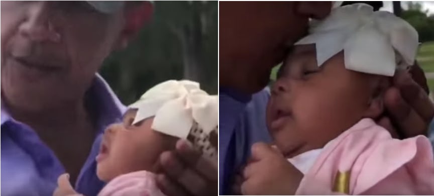 Oh to be a baby in 2019. Well, one baby specifically. A baby who is just hanging out, minding her own business, when out of nowhere she gets to be the luckiest little baby on the planet and she doesn't even know it. But the rest of us know she's lucky, that's for sure. That's because President Barack Obama kissed a tiny baby on the head, as evidenced in this video, and obviously everyone is now envying a 7-week-old baby like crazy people. I mean, she even made the little happy sound when he kissed her head, it was truly spectacular.