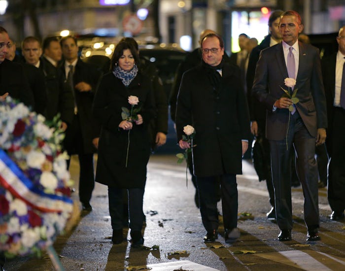After his arrival at Orly airport Sunday night, Obama's motorcade made an unannounced stop at the Bataclan to pay his respects. French prime minister François Hollande and Anne Hidalgo, the mayor of Paris, met him there, and each placed a single white rose in front of the venue. Then Obama "stood in silence with his head bowed and his hands clasped in front of him," according to the BBC. Afterwards, the three leaders walked away together, Obama with his arms around the others.