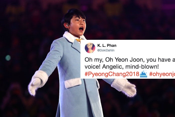The 2018 Winter Olympics in PyeongChang, South Korea, introduced people from all around the world to brand new cultures, customs, and traditions that they might not have been aware of until now. During the closing ceremony of the 2018 Winter Olympics, one boy — Oh Yeon-Joon — sang the Olympic anthem so beautifully and angelically that people couldn't look away or stop talking about. And the reaction to Oh Yeon-Joon's performance of the Olympic anthem on Twitter really shows just how mesmerized people were by watching him and hearing his heavenly voice.