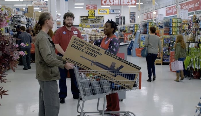 In the scene, Suzanne is checking a customer's cart along with their receipt to make sure everything on the receipt was what they were walking out of the store with. Their list was toothpaste, orange juice, and an AR-15 assault rifle. With that, the customer was OK to leave. While the statement is subtle, it certainly speaks volumes to know that it was so simple for a customer to walk into the fictional big box store that Suzanne worked at and purchase a rifle.