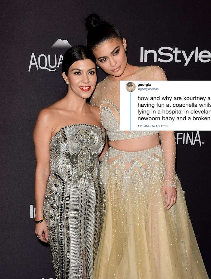 There appear to be a few different reasons people are going after Kourtney and Kylie for hitting Coachella, the first of which being their sister Khloé just gave birth to her first baby, a little girl, on Thursday. Kourtney, who is herself a mom of three to 8-year-old son Mason, 5-year-old daughter Penelope, and 3-year-old son Reign, cut her family trip in Turks and Caicos short to fly to Cleveland, Ohio to be by her sister's side for the birth. Kylie was with her own baby girl, 2-month-old daughter Stormi Webster, but shared a congratulatory message on Snapchat and presumably spoke to her sister in person as well (because we don't actually have access to their private communications, guys). But gossip columnist Perez Hilton took it upon himself to call out both sister for attending Coachella on Friday.