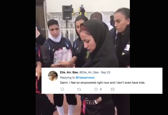 Pejman Rahbar, editor-in-chief of the Iranian sports site Varzesh3, shared a clip of Nouri on Twitter last week. She can be seen standing in a huddle with her team while an infant naps in her arms. The caption, roughly translated, reads: "Zahra Nouri, coach of the Tehran Stars rugby team, leads the team with a young child in her arms. This video is short but amazing." The video was later shared by another Iranian journalist with an English-language caption, and between the two tweets, it's racked up nearly 17,000 likes in a week.