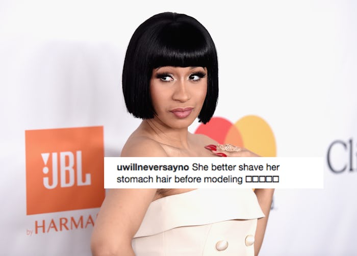 Fashion house Moschino designed Cardi B's outfit, which was a set of color-blocked shorts and a matching bra, topped off with a matching jacket, hat, and necklace. Following the awards show, Moschino shared several photos of Cardi B on Instagram rocking the look. In one of the photos, a small amount of natural hair on Cardi B's stomach is visible. Because — news flash!!! — Cardi B is a human just like you, and she is not required to remove hair from her body anywhere she doesn't want to. But still, that didn't stop commenters from criticizing her for the stomach hair.