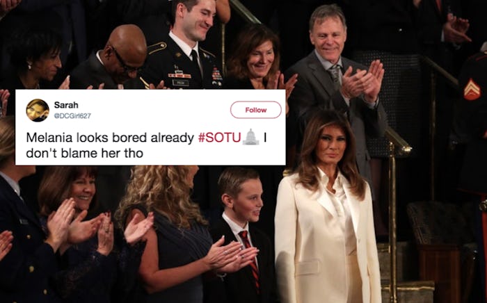 While Melania was seated next to two of her guests for the evening, she didn't arrive with her husband, breaking a years-long tradition, as CNN reported. So when she arrived to the Capitol building on Tuesday night, and took her seat looking vastly unimpressed, Twitter definitely took notice.