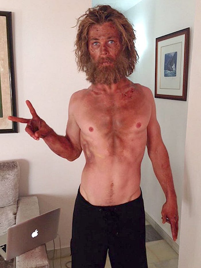 The good news is that a movie based on Herman Melville’s Moby Dick might actually be interesting. The even better news is that Chris Hemsworth is playing the first mate. The scary news? Hemsworth had to lose a lot of weight for In the Heart of the Sea. The actor, who relinquished his title of People’s Sexiest Man Alive to David Beckham last week, posted a pic on Instagram this weekend of him on the set of the film. And he looks mangy, dirty, and super scrawny. Or, like he's been stranded on an island, which is the point. That doesn't mean we have to like it. To get the look for the shipwrecked scenes, he told Entertainment Weekly that he basically had to starve himself: