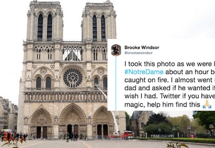 "I took this photo as we were leaving #NotreDame about an hour before it caught on fire," Windsor tweeted Monday evening. "I almost went up to the dad and asked if he wanted it. Now I wish I had. Twitter if you have any magic, help him find this."