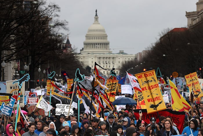 Just because the pipelines got pushed through, however, doesn't mean that protesters have laid down their picket signs. Hundreds of activists showed up in Washington on Friday from across the country, and sister events went on in Los Angeles, New York, Michigan, Washington state, and Nebraska, according to Mic. Activists burned sage in front of the Army Corps of Engineers headquarters and marched past the Trump Hotel to the White House.