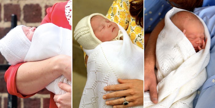 There's a new prince in town. On Monday, Prince William and the Duchess of Cambridge, Kate Middleton, welcomed their third child. The baby is a boy, something they had chosen to keep private for the duration of Middleton's latest pregnancy. Now that the new baby has finally arrived, it's only natural that people have started to compare him to the other royal babies, and looking at photos of the new royal baby vs. Prince George and Princess Charlotte is one thing royal family fans are doing to celebrate the birth of the latest little member of the British royal family.