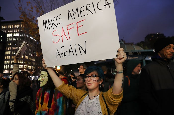 When the election results rolled in Tuesday night and into early Wednesday morning, people could not believe what was happening. A man that had for months represented so much hate and and divisiveness, Donald Trump, was chosen to become the 45th president of the United States of America — and that end result didn't even represent the popular vote. On Wednesday night, voters took out to the streets in opposition and photos of the Trump protests show just how unrepresented thousands of people feel at this very moment.