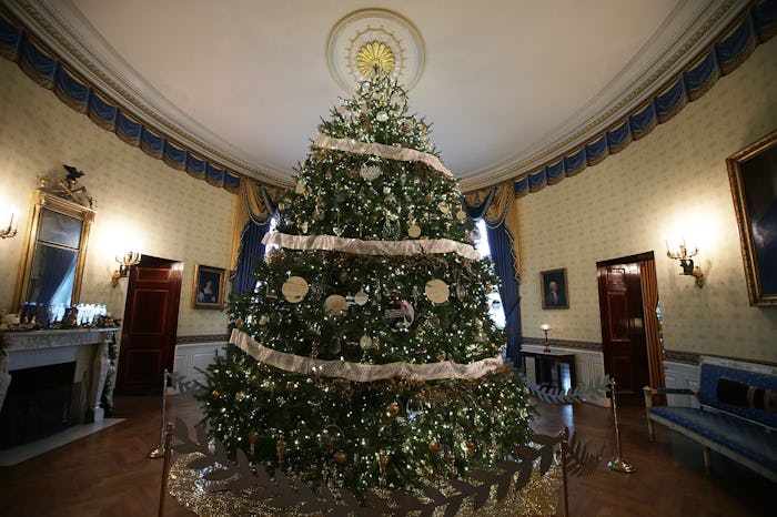 For Melania Trump’s first Christmas in the White House, she chose a simple theme that honored each of the states and territories of the country with ornaments featuring their seals, according to NBC Washington. And 2018’s tree is a theme of "American Treasures" and includes over 500 feet of gold-trimmed blue ribbon, according to the Washington Post.