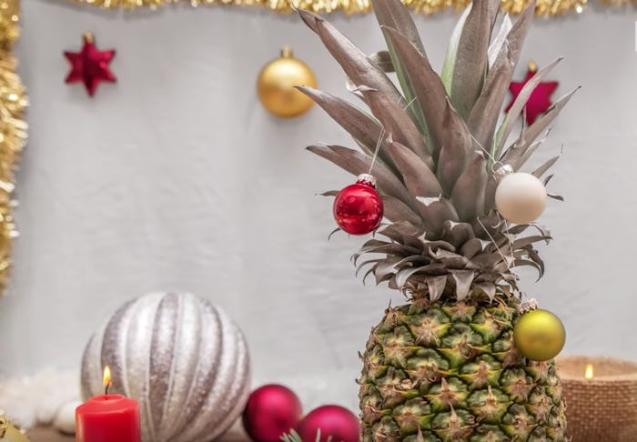 Although the fruit is traditionally associated with tropical climates, there is nothing like a little wishful thinking when you're doing your holiday shopping in 30 degree weather and snowed in during the holiday season. While one would have expected this trend to have a symbolic meaning or have started for a specific reason, according to Thrillist, it is just that — a trend. One person on Pinterest shared a photo of their decorated pineapple and others followed suit.