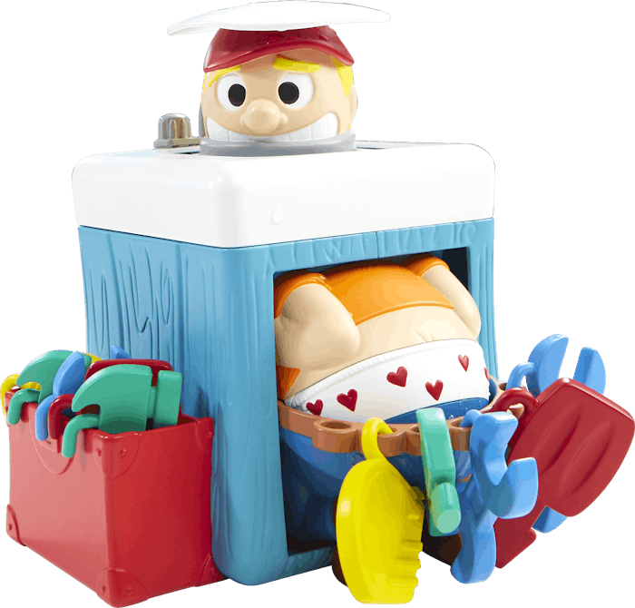 In Plumber Pants, your child gets to play a prank on the unsuspecting plumber. As he works to fix a clog under a sink, players take turns stealing various tools from his tool box. One by one, they hook the tools onto his plumber's belt, which slips down to reveal some particularly adorable heart-printed underpants. If a player attaches the tool that ends up making his pants fall down, water will spray from the sink and that player is eliminated. The winner of the game is, you guessed it, the only player to not cause the plumber's pants to fall down is the winner.