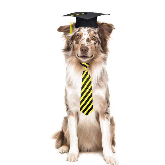 Have a labradoodle who's about to graduate MIT with a bachlors in Chemical Engineering? Well, then you definitely need to snag this self-adhesive pet mortarboard and necktie combo! Just remember to take deep breaths and stay calm when Scruffles later tells you he wants to take a year off to pursue improv. And then proceeds to both eat and vomit up his tassel.