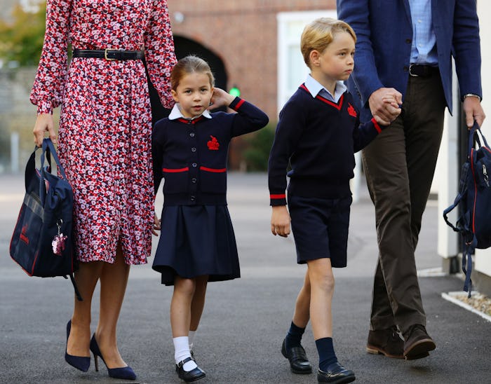 The first time royal fans saw evidence that Princess Charlotte was into a very '80s trend, aka the love of unicorns, was in early September. She and her older brother, 6-year-old Prince George, were escorted to their first day of school at Thomas's Battersea in London by their two parents, the Duke and Duchess of Cambridge, on Thursday, Sept. 5. And as is tradition, a few photographers were allowed on the scene to film their arrival, and they spotted more than just Middleton's amazing blowout and the children's adorable school uniforms while there. Eagle-eyed fans also took note of a certain accessory Princess Charlotte had attached to her backpack, which her mother had carried for her — a sparkly unicorn keychain, according to Hello! magazine. You know, for all of her key carrying needs.