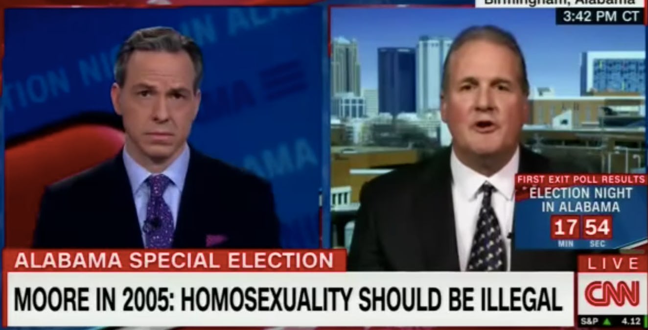 On Tuesday, Alabama voters headed to the polls for a special election to fill one vacant Senate seat. The election, though, has garnered national attention after the Republican candidate, Roy Moore, fervently denied several women's accusations that he pursued sexual relationships with him when they were teenagers and he was in his 30s. But Moore critics contend that his ultraconservative views made him an inappropriate choice for the position regardless of the reports of sexual misconduct. Among those views is Moore's unabashed, long-held belief that Muslims should not hold elected office, an issue that CNN's Jake Tapper raised with a Moore surrogate on Election Day. And in the now-viral interview, Roy Moore's spokesperson was stunned to silence when Tapper busted his flimsy argument wide open.