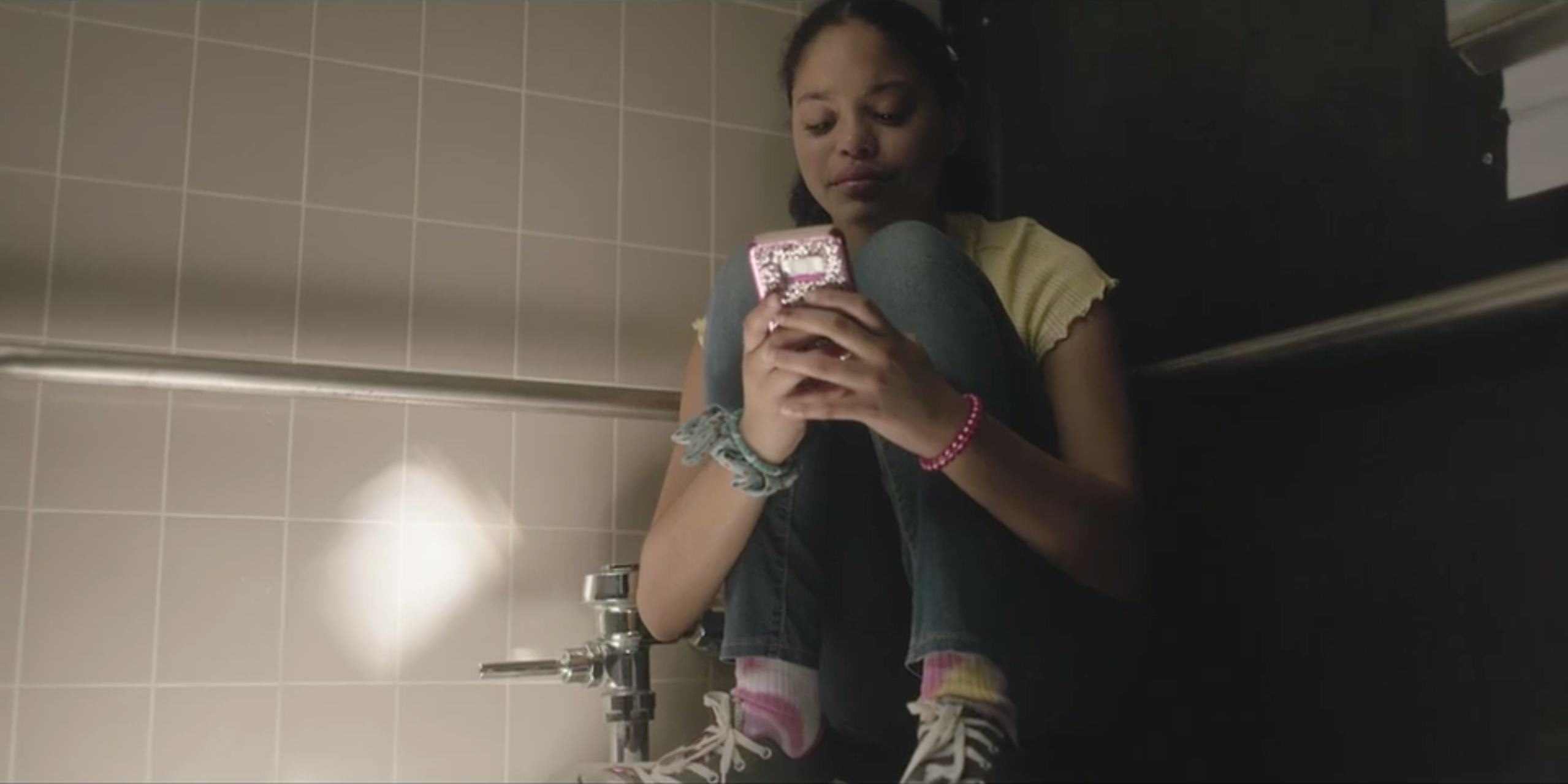 In the PSA's final scene, a girl texts her mother "I love you" while hiding in a bathroom stall. "I finally got my own phone to stay in touch with my mom," the teary-eyed girl says before viewers hear the bathroom door open and the approach of slow, menacing footsteps.