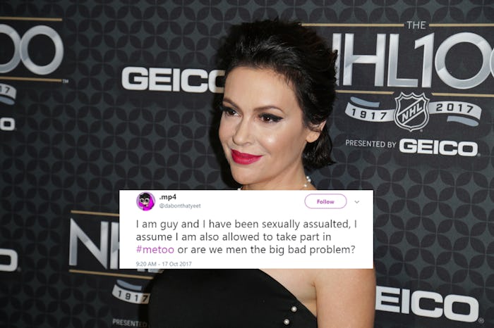 Milano specifically requested that women use the phrase, but according to the Independent, about 30 percent of Twitter users posting about the hashtag have been men (and there's no estimate for how many gender non-conforming people used the hashtag). Some spoke up to say they stood with women who have been victimized. Some pledged to educate others about rape culture. And then there were the ones who just couldn't stand to see women in the spotlight, and took the opportunity to mansplain that actually, men can also be sexually harassed and assaulted, and the women are forgetting about them with this hashtag.