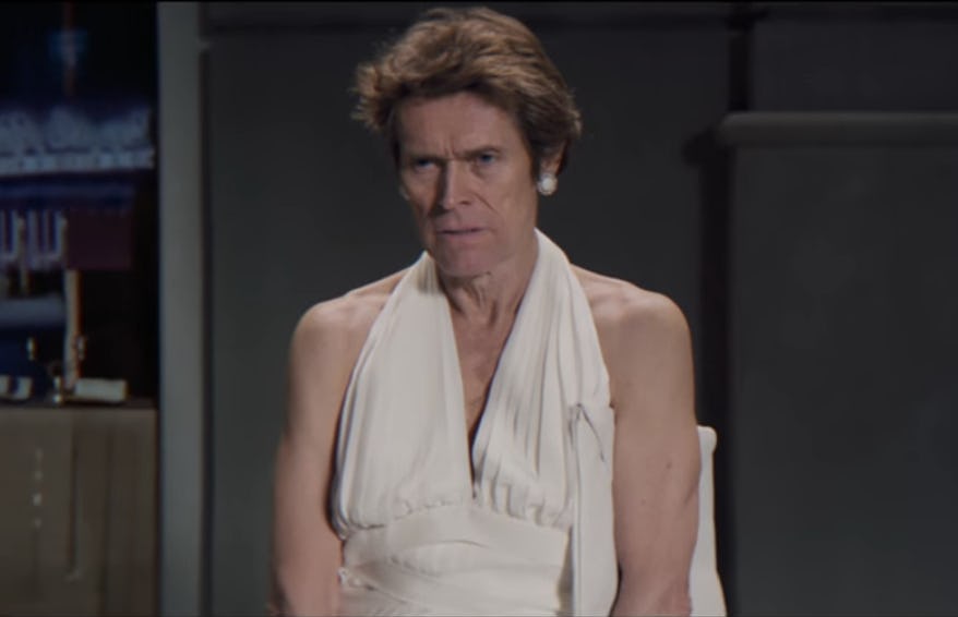 As Monroe's iconic white dress blows up and over Dafoe's face, exposing his fitted white underwear, the actor expresses his discontent with having to film such a "disastrous" scene. "Sweetie, don't look at me like that, it's gonna be amazing," replies the film's smarmy director, upon seeing the actor's disgruntled expression. When Dafoe argues that the scene is impractical ("Who's the genius who puts a girl in heels on a subway grate?" Dafoe yells at one point), a producer hands him a Snickers bar, saying, "Eat a Snickers — you get a little cranky when you're hungry." Magically, Dafoe then morphs back into a giggling, sweet-faced Monroe, and all is good in the fake Hollywood world once more.