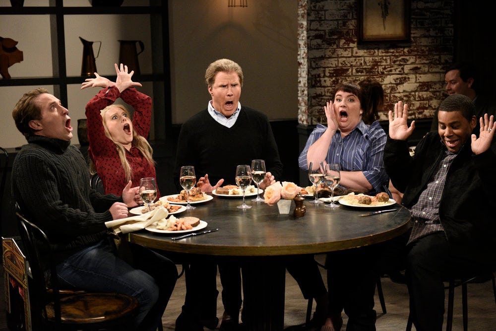 The sketch opened with six friends enjoying a nice friendly dinner at a well-reviewed restaurant they all love. That is, until one friend (played by Heidi Gardner who is, by the way, killing it this season) said, "Did any of you guys read that op ed piece about —" but she was cut off by her partner saying, "Honey, no." When she did finish and said, "Aziz Ansari," the camera panned to the whole table's stunned and terrified faces. But bravely they agreed to talk about it. "Well it's come to this. I'll go first," said Kate McKinnon, to which Ferrell asked, "Are you sure you wanna do this?"