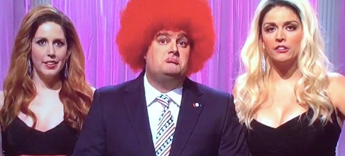 The show was closed out by Vanessa Bayer and Cecily Strong in their recurring roles as former porn stars who shoot terrible amateur commercials on spec in order to get free merchandise from brands like Manolo Blahnik, Bvlgari, and Lamborghini. This time around, the porn stars were shooting an unsolicited campaign ad for Donald Trump.