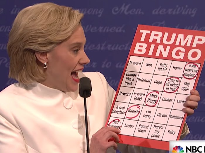 "Bingo! I got bingo!" she yelps when Baldwin utters the racist phrase, and whips out a BINGO card crammed with outrageous admissions and insults Trump has flung at others throughout the campaign cycle. "I have 'bad hombres,' 'rapists,' 'Miss Piggy,' 'they're all living in hell,' and 'if she wasn't my daughter'!"