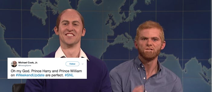 The best part about this sketch is that the actors who play Prince William and Prince Harry — Alex Moffat and Mikey Day, respectively — as one Twitter user pointed out, are the same actors who portray Trump's sons, Donald Trump Jr. and Eric Trump, on SNL. While there are tons of differences between the two pairs of siblings, you can't help but to laugh at the concept.