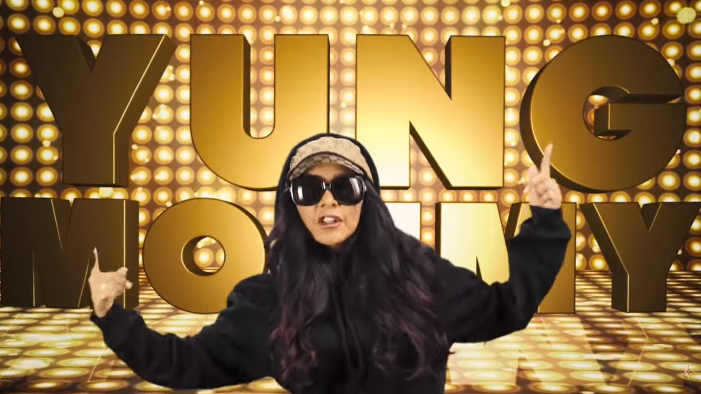 The track begins with a quick review of how Snooki got to where she is: her wild beginnings partying with "JWoww, Sammi, and Ronnie" (no mention of Pauly D or The Situation? Ouch!), and how she's grown now, married to Jionni LaValle, with two kids who "call me mommy." Oddly, even her rapping is auto-tuned, as she references baby food and potty training and her toddlers guest star in the clip. "Stretch marks!" she croons. "Saggy nipples!" Well, alright, then. The aesthetic is fever dream meets day care, as rainbows and plastic dinosaurs fly across the screen, and Snooki's disembodied head floats in the air. It's hard to tell if she's 100 percent in on the joke, or just 75 percent.