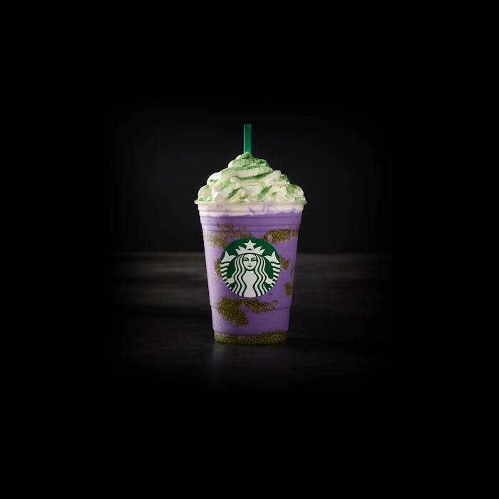 So, what's exactly in this purple and green beverage? According to the Starbucks Newsroom, it's made from toad's breath, bat warts, and a sprinkle of lizard scale. More specifically, "The charming concoction starts with a purple blend of 'toad’s breath' and orange crème Frappuccino and a swirl of green 'bat warts' (made with chia seeds). A topping of vanilla whipped cream and dusting of green 'lizard scale' powder finishes the beverage," according to Heidi Peiper writing for the coffee brand. Yum! In the same article, Jennica Robinson, a member of the Starbucks product development team, is quoted as saying that the drink "gets a little bit of juicy-ness from the orange flavor” and described it as "very fun, vibrant, bubbly, the life of the party." In other words, it's the perfect afternoon snack when you're craving something sweet but need to save the Halloween candy for, you know, actual trick-or-treaters.