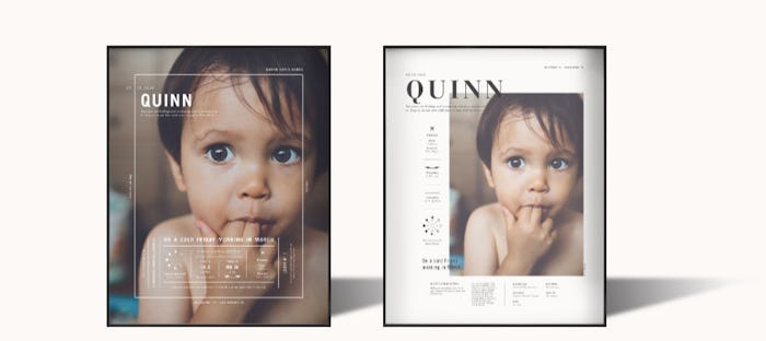 The Signature Art Print is the perfect gift because it highlights the day your little one was brought into this world in a completely customized picturesque way. The Signature Art Print tells the story of your child and their birthday by combining your favorite photo and graphic design to create a personalized piece that will surely be the new favorite on your wall. There's your child's astrology details, birth place, birth details, the moon phase, and more. It's not just a picture of your child — it's the story of the day they were born.