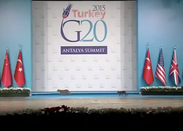 What has the ability to stop some of the world’s most powerful and influential leaders — leaders like Obama, Putin, and China’s Xi Jinping — in their tracks? A parade of cats, of course! On Sunday, a group of stray cats took over the G20 summit, a few mere minutes before various leaders were scheduled to appear onstage, reports The Guardian. While it wasn't exactly the appropriate venue for such shenanigans, the cats — in traditional cat fashion — didn’t care; they sauntered across the stage and rooted around for food (or a soft human hand, it's not clear which) before running away without so much as a second glance.