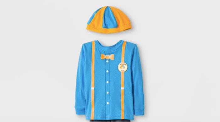 The jammie set features a long-sleeve shirt with Blippi's signature orange suspenders and bowtie printed onto the fabric, as well as some Blippi-esque gray pants. And of course, no Blippi outfit would be complete without an orange and blue beanie hat. The outfit is 100 percent cotton, and sizes ranges from 2T to 5T.