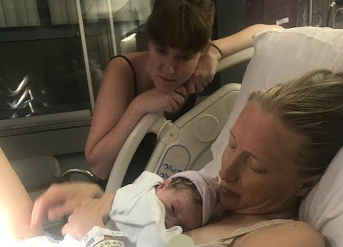 With the next contraction, I bore down into the lava pit and shot her out of me. Her whole body at once, head to toes. I did not even feel her leave. I wondered if death would be similarly traceless. She (I did not know the sex yet) was on my chest for only a minute before they cut her cord and brought her to the far corner to be checked. I did not see the doctor, who had exited quietly and with grace, taking no credit. My midwife leaned over me with a spelunking headlamp to inspect the damage, encouraging me to get the placenta out, because, no, you're not done pushing.