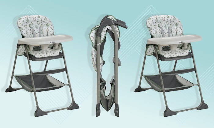 Considering that it's compact, foldable with one hand, and very affordable, it's no wonder this Graco slim snacker high chair has earned a nearly perfect 4.8 star-rating on Amazon from parents. This compact high chair folds down to just around 3-feet high and 10-inches deep and weighs just about 14 pounds. It also boasts three useful reclining positions, a footrest, a built-in full-sized cup holder, and a mesh basket underneath the chair for storage.