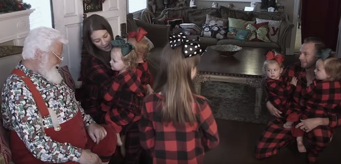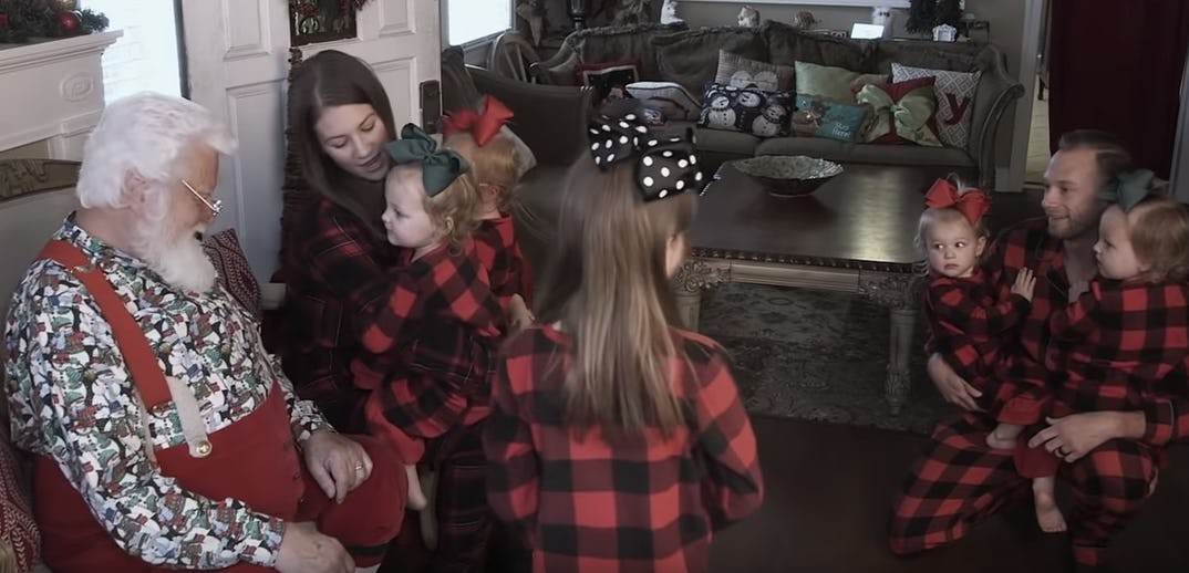 The clip opens with Adam and Danielle joining their families for a holiday photo with Santa. The quints — Olivia Marie, Ava Lane, Hazel Grace, Parker Kate, and Riley Paige — and their older sister Blayke, are wearing adorable Christmas dresses and hair bows, matching the rest of the family’s red plaid holiday theme. “It’s my favorite time of year, it’s Christmas,” says Danielle. “We’ve had a rough month or so, but we’re with my mom and my sisters, and our families. And we’re getting Santa photos.”
